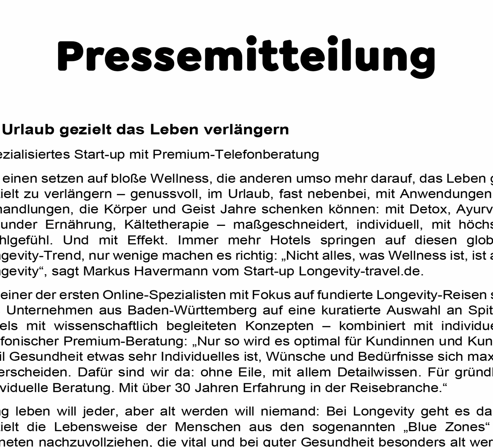 Das Start-up Longevity Travel aus Baden-Württemberg positioniert sich als Spezialist für hochwertige Longevity-Reisen mit Fokus auf Gesundheit, Regeneration und Lebensverlängerung im Urlaub.