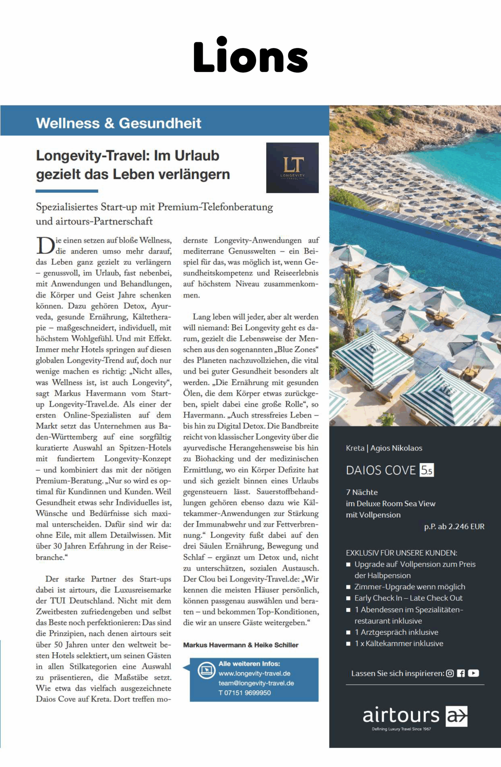 In Kooperation mit airtours, der Luxusreisemarke der TUI, bietet Longevity Travel exklusive Reisen für Menschen, die Gesundheit, Genuss und Erholung bewusst verbinden möchten. Besonders beliebt ist das Daios Cove Resort auf Kreta, wo modernste Longevity-Anwendungen auf mediterrane Lebensfreude treffen. Hier entstehen Programme, die Körper, Geist und Seele harmonisieren – vom Sleep-Reset über Immunstärkung bis hin zu Stressabbau und Digital Detox.